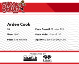 | Finish | 3.1 | 18:00 | 5:48/miles | 3.1 | 18:00 | 5:48/miles | 12 | 10 M | 5 M20-29 |