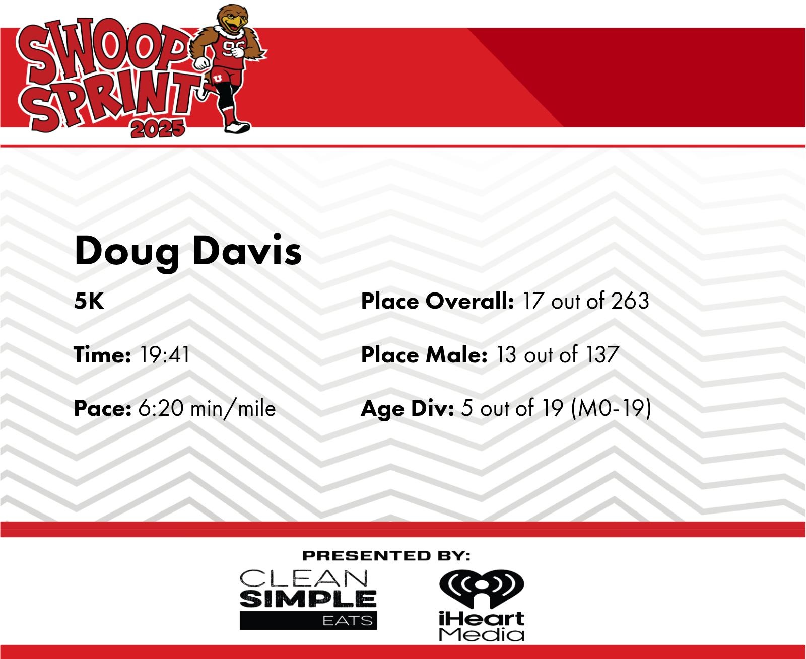 | Finish | 3.1 | 19:41 | 6:20/miles | 3.1 | 19:41 | 6:20/miles | 17 | 13 M | 5 M0-19 |