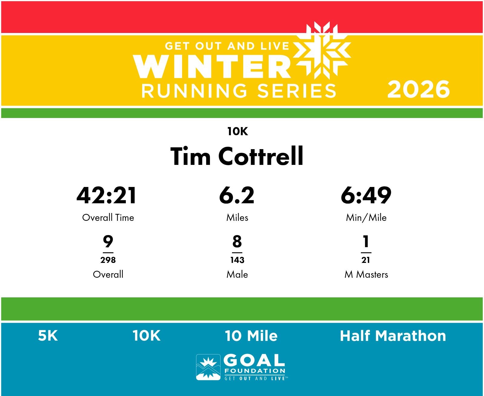 | Finish | 6.2 | 42:21 | 6:49/miles | 0.5 | 3:41 | 7:21/miles | 9 | 8 M | 1 M Masters |