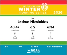 | Finish | 6.2 | 40:47 | 6:34/miles | 0.5 | 3:42 | 7:22/miles | 5 | 5 M | 1 M19-24 |
