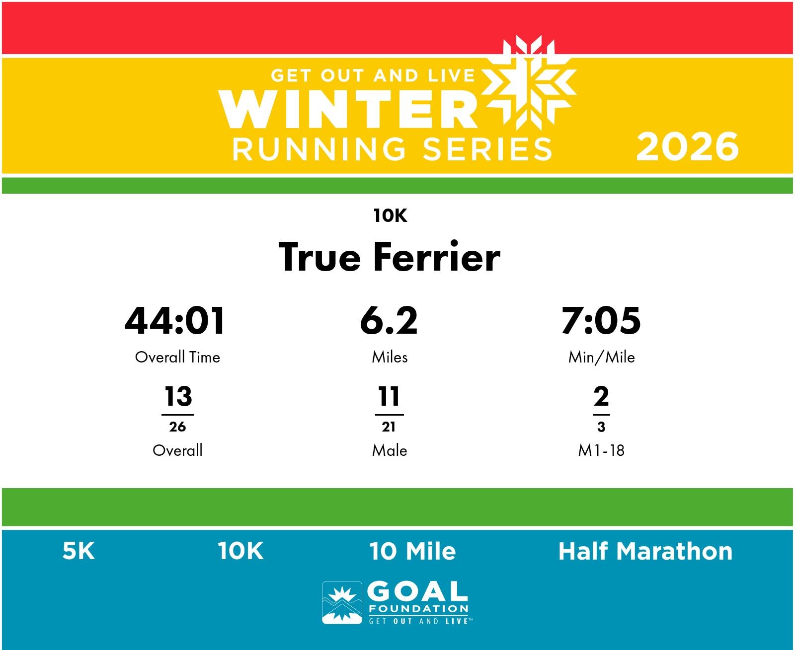 | Finish | 6.2 | 43:57 | 7:05/miles | 0.5 | 3:45 | 7:29/miles | 13 | 11 M | 2 M1-18 |