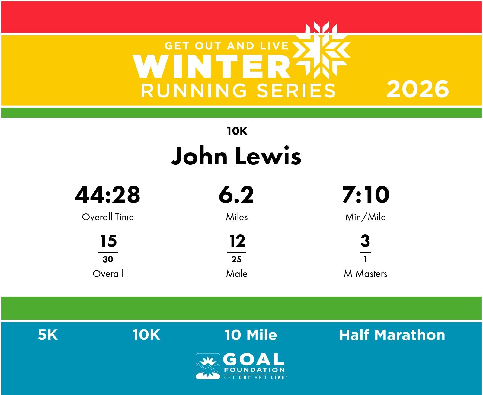 | Finish | 6.2 | 44:24 | 7:09/miles | 0.5 | 3:51 | 7:41/miles | 15 | 12 M | 3 M Masters |