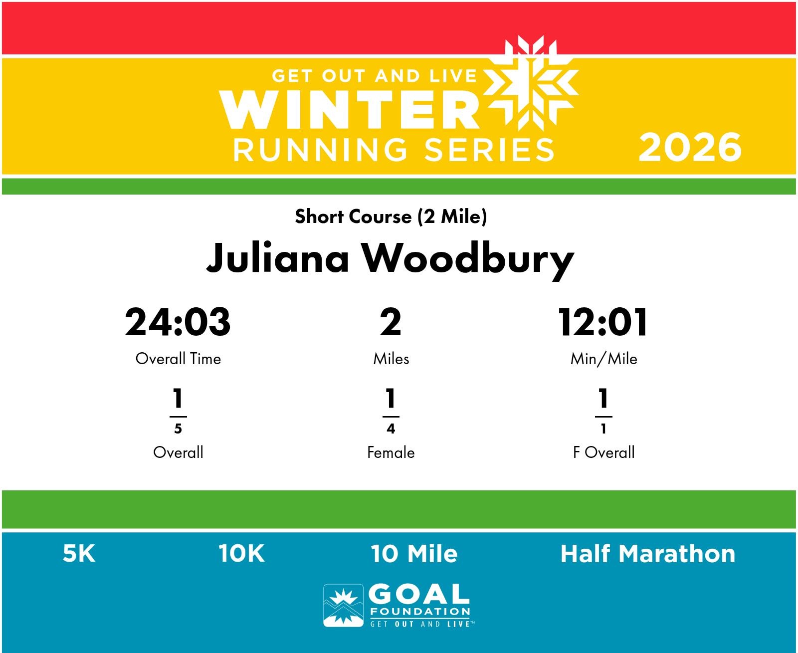 | Finish | 2.0 | 24:03 | 12:01/miles | 2.0 | 24:03 | 12:01/miles | 1 | 1 F | 1 F Overall |