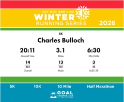 | Finish | 3.1 | 20:11 | 6:30/miles | 1.55 | 8:27 | 5:26/miles | 14 | 13 M | 3 M35-39 |