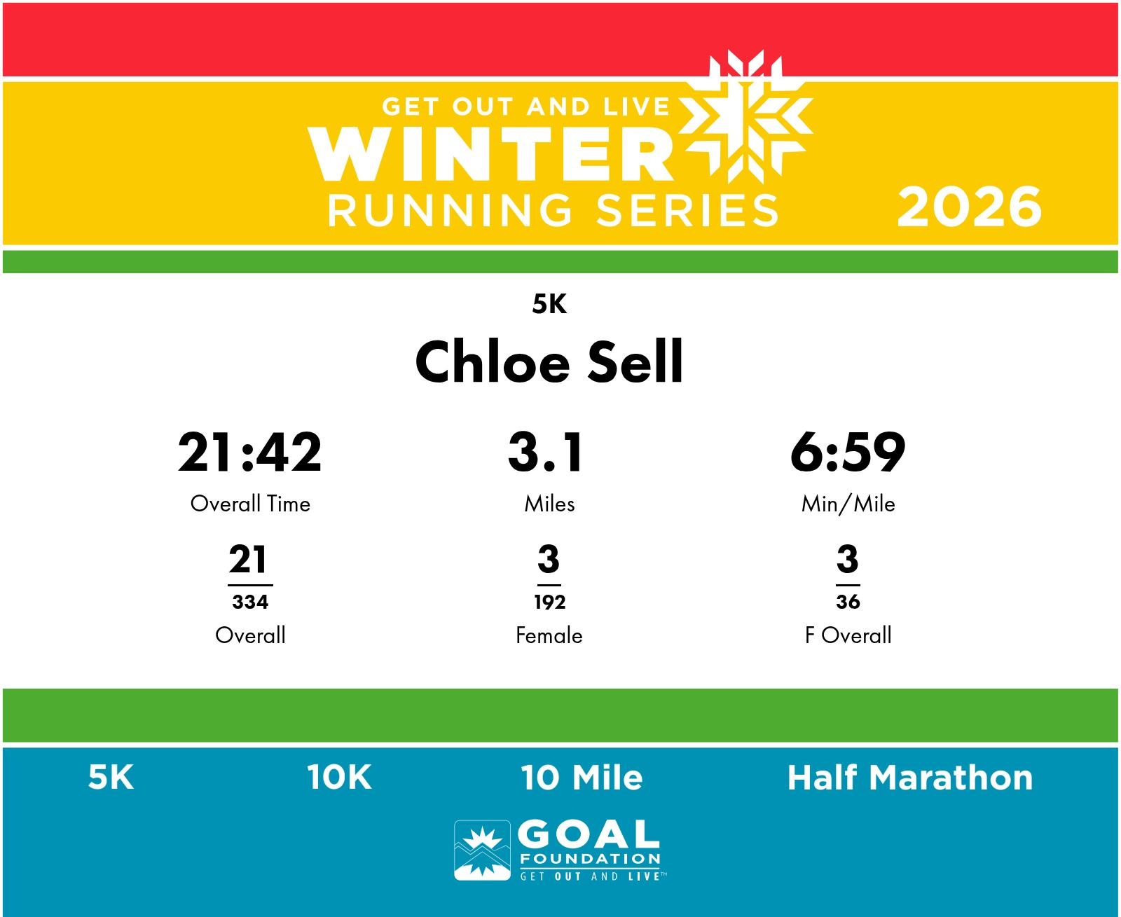 | Finish | 3.1 | 21:42 | 6:59/miles | 1.55 | 9:48 | 6:19/miles | 21 | 3 F | 3 F Overall |