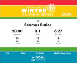 | Finish | 3.1 | 20:00 | 6:27/miles | 1.55 | 8:41 | 5:35/miles | 13 | 12 M | 3 M1-18 |