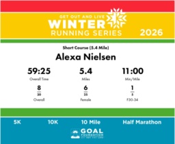 | Finish | 5.4 | 59:25 | 11:00/miles | 5.4 | 59:25 | 11:00/miles | 8 | 6 F | 1 F30-34 |