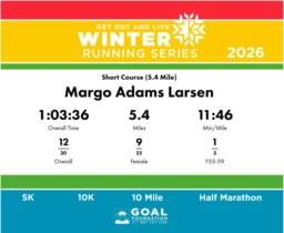 | Finish | 5.4 | 1:03:36 | 11:46/miles | 5.4 | 1:03:36 | 11:46/miles | 12 | 9 F | 1 F55-59 |