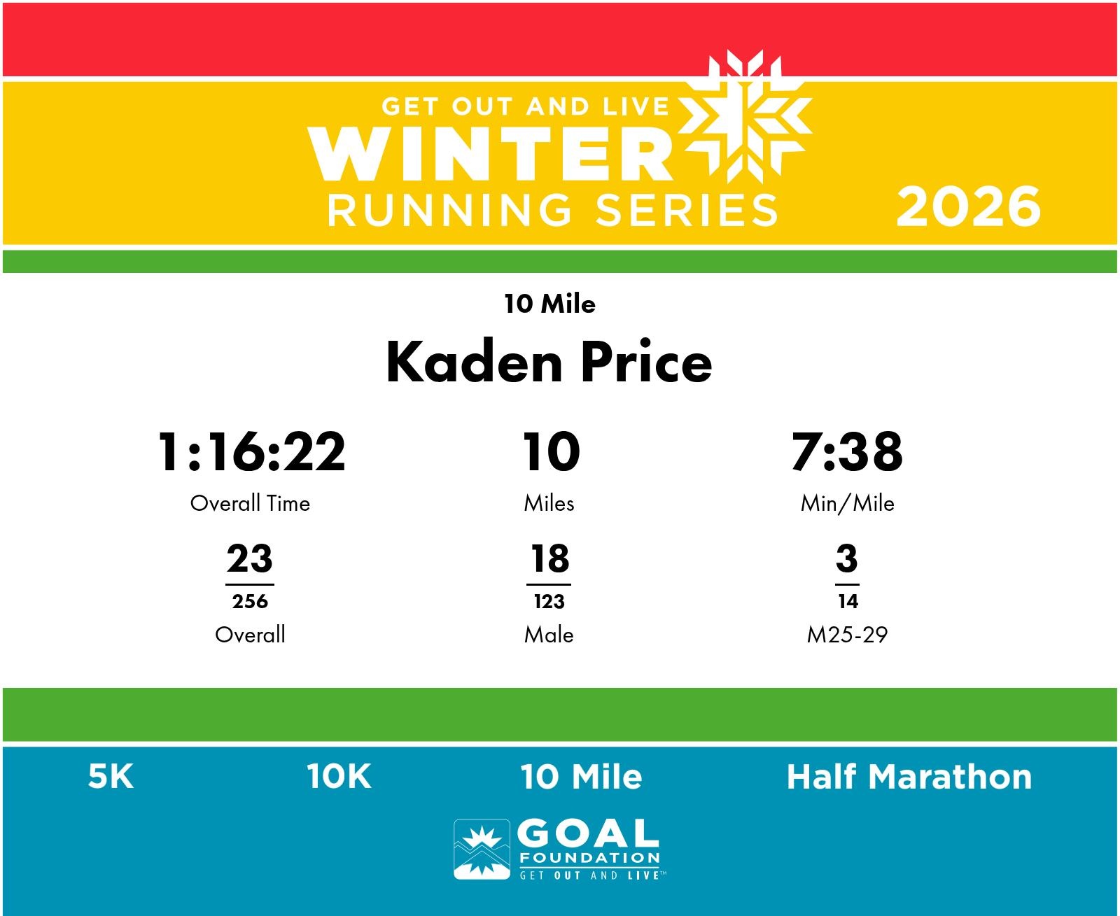| Finish | 10.0 | 1:16:22 | 7:38/miles | 5.0 | 36:09 | 7:13/miles | 23 | 18 M | 3 M25-29 |