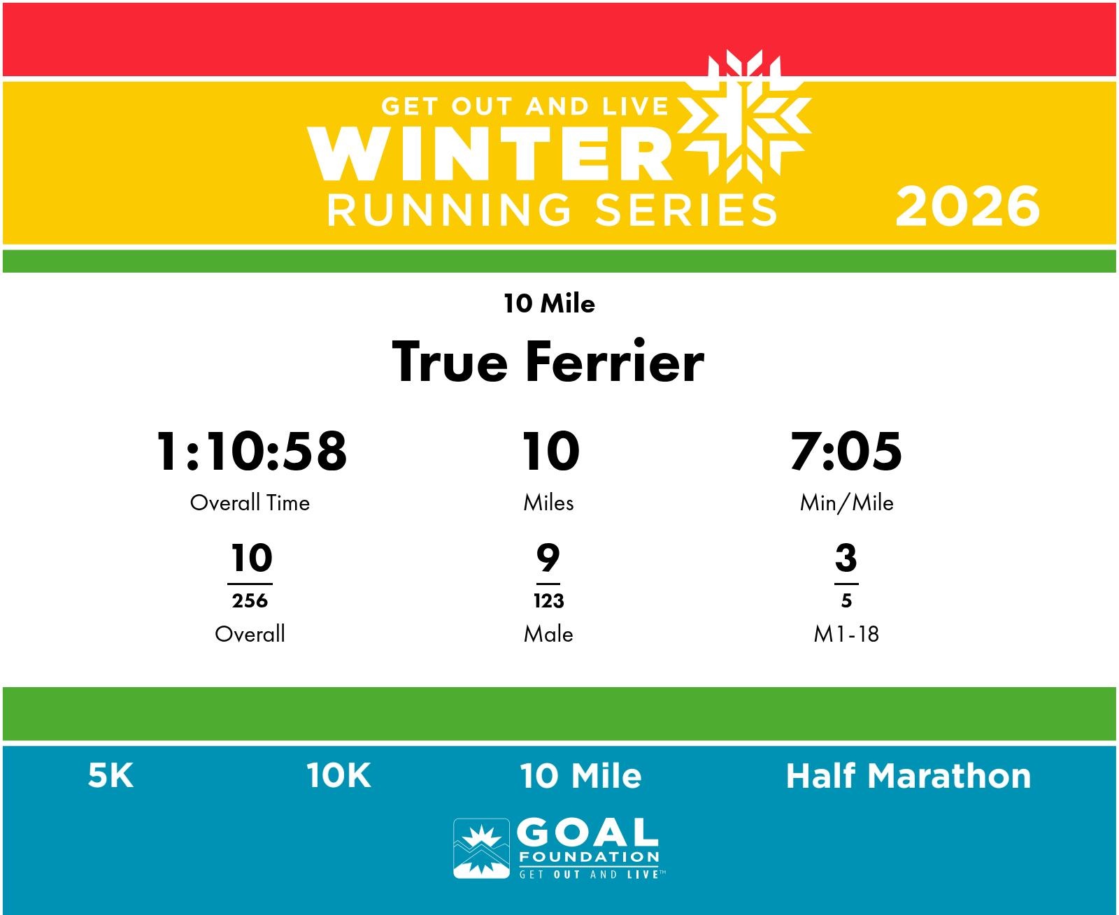 | Finish | 10.0 | 1:10:58 | 7:05/miles | 5.0 | 33:17 | 6:39/miles | 10 | 9 M | 3 M1-18 |