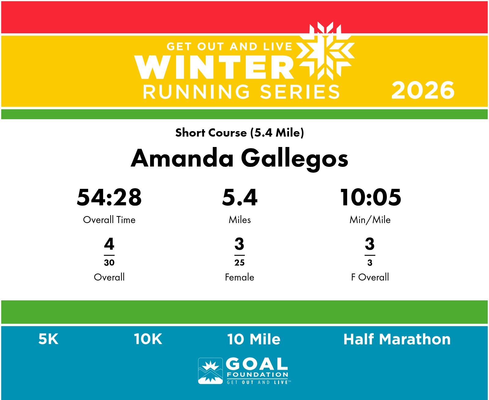 | Finish | 5.4 | 54:28 | 10:05/miles | 5.4 | 54:28 | 10:05/miles | 4 | 3 F | 3 F Overall |