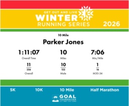 | Finish | 10.0 | 1:11:07 | 7:06/miles | 5.0 | 32:42 | 6:32/miles | 11 | 10 M | 1 M30-34 |