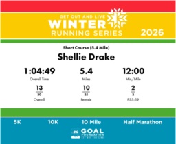 | Finish | 5.4 | 1:04:49 | 12:00/miles | 5.4 | 1:04:49 | 12:00/miles | 13 | 10 F | 2 F55-59 |