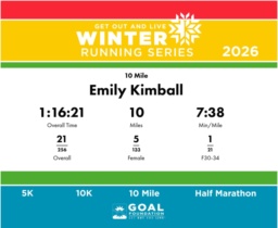 | Finish | 10.0 | 1:16:21 | 7:38/miles | 5.0 | 36:00 | 7:11/miles | 21 | 5 F | 1 F30-34 |