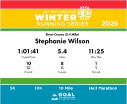 | Finish | 5.4 | 1:01:41 | 11:25/miles | 5.4 | 1:01:41 | 11:25/miles | 10 | 8 F | 1 F60-64 |