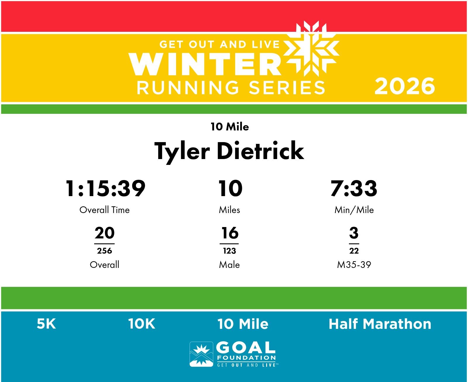 | Finish | 10.0 | 1:15:39 | 7:33/miles | 5.0 | 34:41 | 6:56/miles | 20 | 16 M | 3 M35-39 |