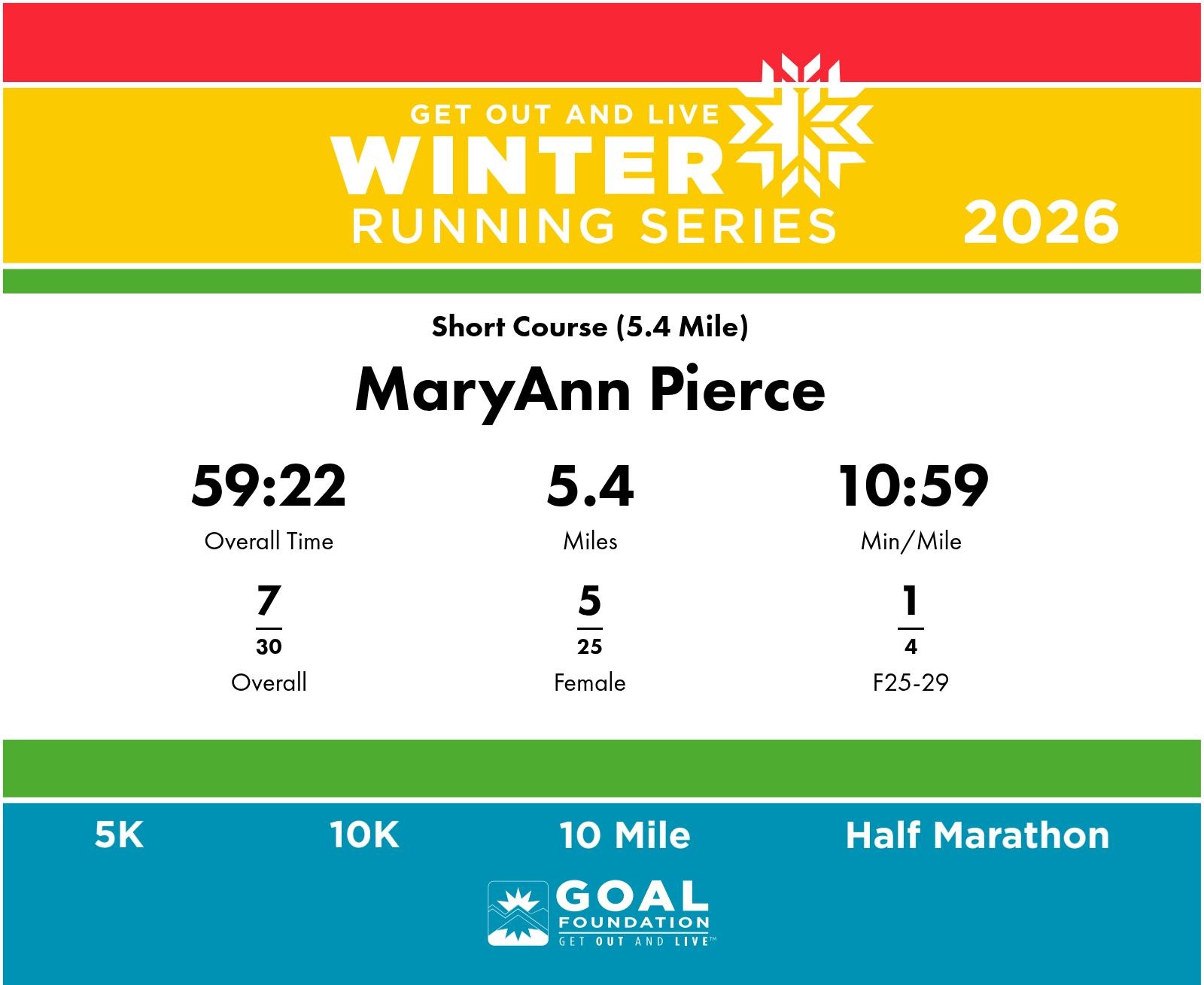 | Finish | 5.4 | 59:22 | 10:59/miles | 5.4 | 59:22 | 10:59/miles | 7 | 5 F | 1 F25-29 |