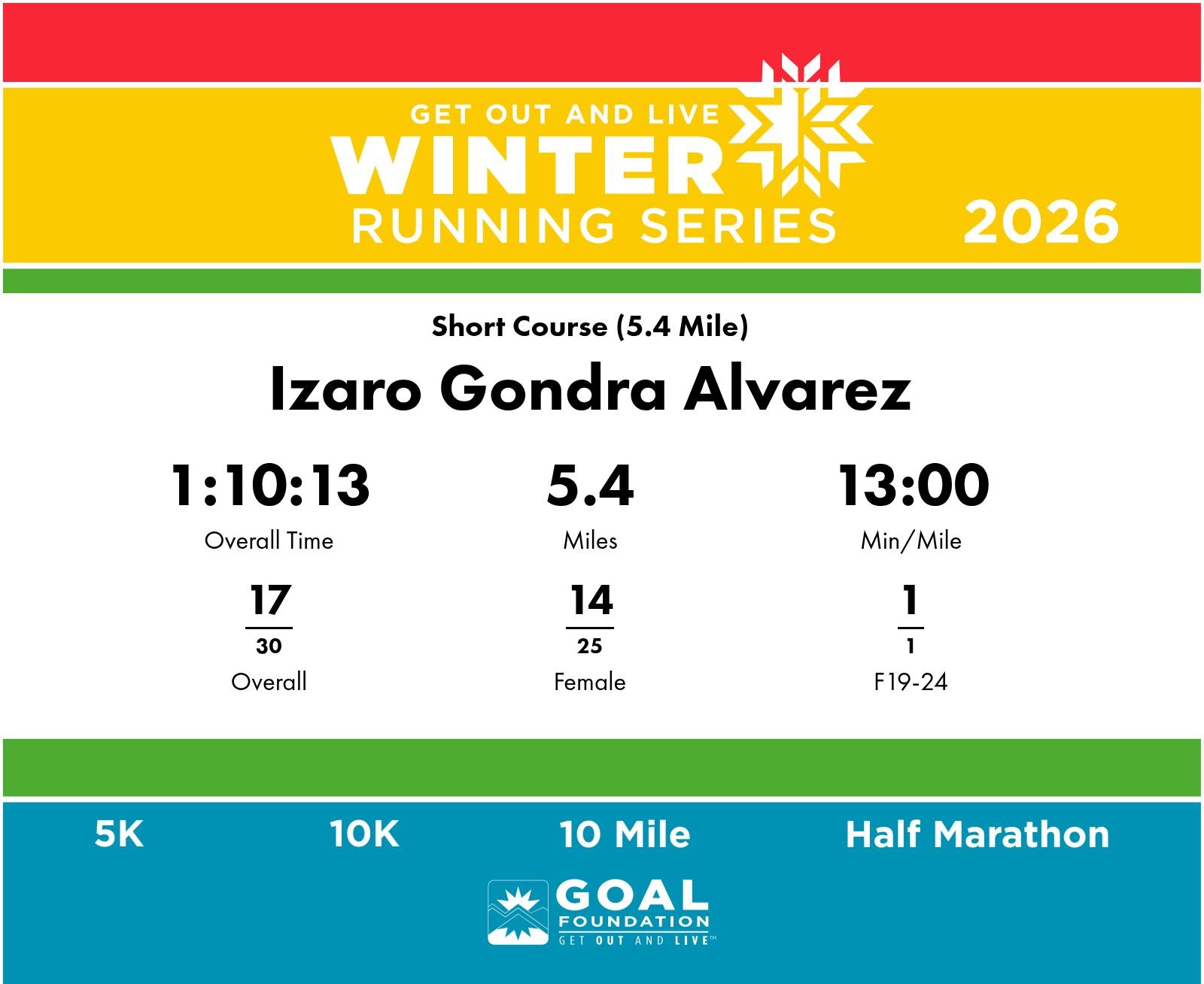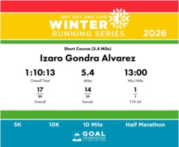 | Finish | 5.4 | 1:10:13 | 13:00/miles | 5.4 | 1:10:13 | 13:00/miles | 17 | 14 F | 1 F19-24 |